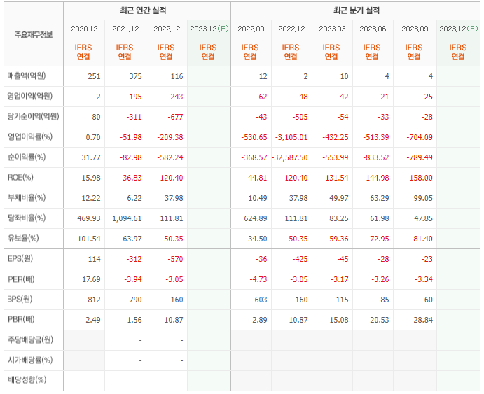 2022년 매출은 116억, 영업이익은 -243억, 당기순이익은 -677억입니다. 그리고 영업이익률은 -209.38%입니다.