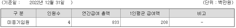 미등기임원의 평균연봉은 2억 800만원이고 직원수는 4명입니다.