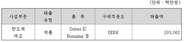 당사는 넓은 범위에서 반도체 산업과 디스플레이 반도체 및 부품산업을 영위하고 있습니다. 반도체 산업은 제조 공정에 따라 전공정산업과 후공정산업으로 구분할 수 있으며 전공정산업은 반도체 칩을 제조하기 위한 관련 산업, 후공정 산업은 전공정에서제작된 칩을 반도체 제품으로서의 기능을 하고, 외부환경으로부터 칩을 보호할 수 있게 제조하기 위한 관련 산업입니다. 당사는 비메모리 반도체에 속하는 디스플레이 구동 반도체 DDI(Display Driver IC)에 대한 후공정 사업을 주력으로 하고 있으며 특히, 전공정에서 제작된 웨이퍼 상태인 칩을 범핑(칩과 기판 사이를 연결할 수 있도록 하는 전극 구조물 형성), 필름 기판에 반도체 칩의 조립 및 가공, 칩과 반도체 제품을 테스트하는 반도체 후공정 서비스 전문 회사입니다.