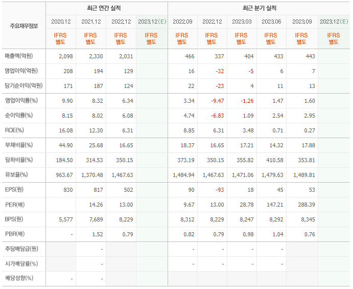 2022년 매출은 2031억, 영업이익은 129억, 당기순이익은 124억입니다. 그리고 영업이익률은 6.34%입니다.