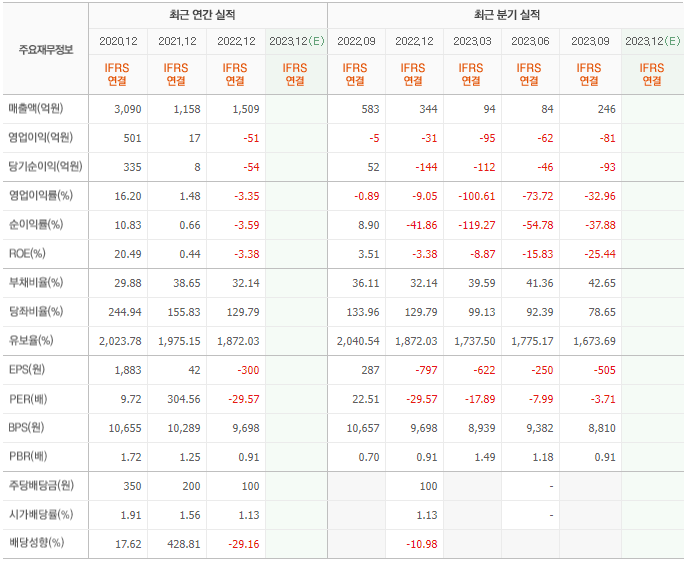 2022년 매출은 1509억, 영업이익은 -51억, 당기순이익은 -54억입니다. 그리고 영업이익률은 -3.35%입니다.
