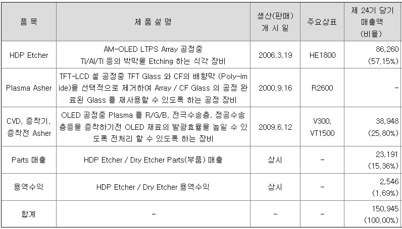주요 사업영역으로는 LCD 및 OLED 의 구동회로(TFT) 및 Touch Sensor 제조의 핵심 공정 중 하나인 박막식각 공정 중 Plasma를 이용한 HDP(High Density Plasma) Dry Etcher 장비와 OLED 증착공정 중 진공상태에서 Glass 기판을 이송하는 진공물류장비(증착기)가 있습니다. 또한 Plasma 기술을 활용한 Plasma Asher 및 식각장비도 시장상황에 따라 지속적으로 판매 되고 있습니다.