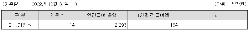 미등기임원의 평균연봉은 1억 6400만원이고 직원수는 14명입니다.