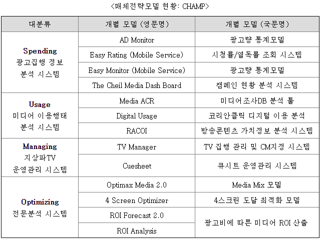 당사가 제공하는 마케팅 솔루션은 크게 광고 기획/제작, 매체(TV/라디오/옥외 등) 선정, 프로모션 대행 등으로 구분되며, 최근에는 디지털화 된 마케팅 환경속에서 소비자의 온라인 구매 패턴 분석 및 개인화 마케팅 전략 수립 등 AdTech를 활용한 솔루션 또한 제공하고 있습니다.
