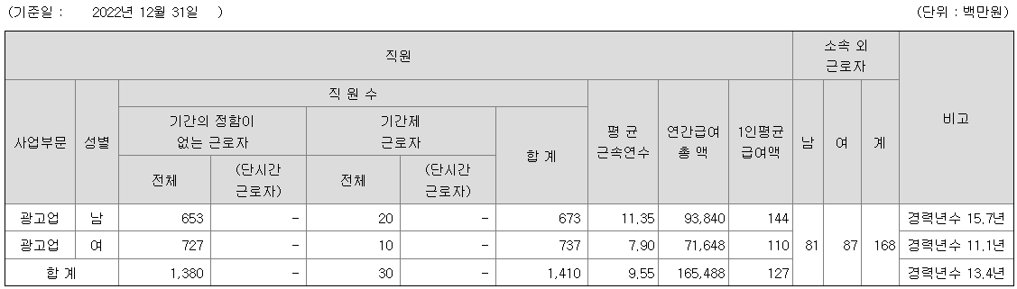 | 사업부문 | 성별 | 직원수 | 평균근속연수 | 평균연봉(백만) |