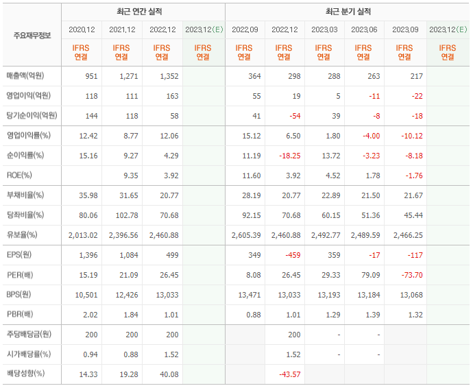 2022년 매출은 1352억, 영업이익은 163억, 당기순이익은 58억입니다. 그리고 영업이익률은 12.06%입니다.