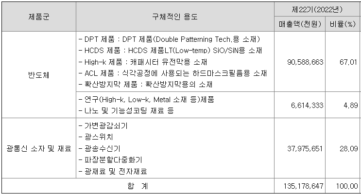 당사는 반도체 소자 형성용 박막 재료 전문기업입니다. 반도체 기술의 발전과 더불어 칩은 더욱 미세화 되어감에 따라 다양한 반도체 재료 시장이 형성되고 있습니다. 반도체 장비만으로는 해결할 수 없는 기술적 한계들을 재료의 변화를 통하여 극복하고 있는 상황에서 특히 당사가 생산하고 있는 반도체 박막 재료는 반도체의 성능과 직결되기 때문에 반도체 공정 기술의 발전과 더불어 지속적인 성장이 가능한 사업 부문입니다.