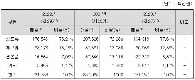 당사의 주요 제품은 펌프형 용기, 튜브형 용기, 견본용 용기로 구분됩니다. 국내 최초로 화장품용 디스펜스 펌프 개발 및 상용화에 성공한 이후, 펌프형 용기는 당사의 핵심 제품으로 자리매김하고 있습니다. 당사가 경쟁우위에 있는 용기제조 기술은 제품의 특성에 따라 의약품, 생활용품 등에도 응용하여 적용할 수 있습니다.