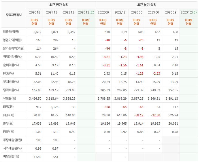 2022년 매출은 2347억, 영업이익은 13억, 당기순이익은 4억입니다. 그리고 영업이익률은 0.55%입니다.