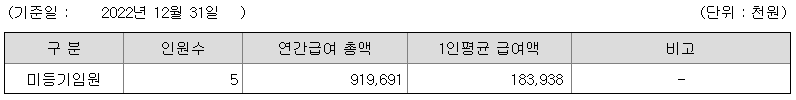 미등기임원의 평균연봉은 1억 8393만원이고 직원수는 5명입니다.