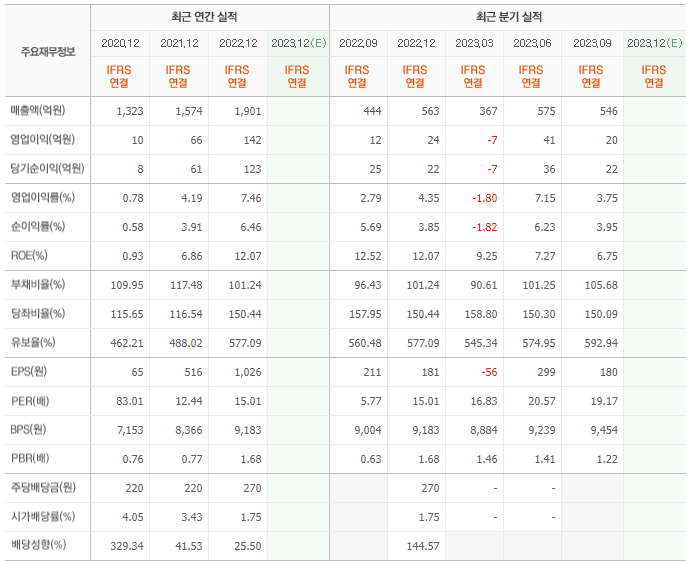 2022년 매출은 1901억, 영업이익은 142억, 당기순이익은 123억입니다. 그리고 영업이익률은 7.46%입니다.
