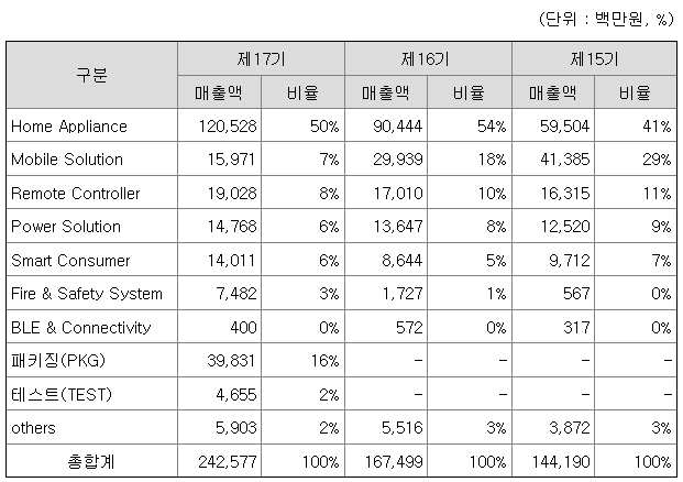 당사는 삼성전자, LG전자, 위니아, 위닉스 등 국내 가전사들을 비롯하여 중국의 Midea, XIAOMI, Lenovo 및 일본, 유럽, 미국의 유수한 업체에 제품을 공급하며, 당사의주요종속회사인 (주)윈팩을 통하여 반도체 공정의 주요한 세부공정 중 패키징(PKG)과 테스트(TEST)를 포함하는 반도체 후공정 외주사업을 영위하고 있습니다.