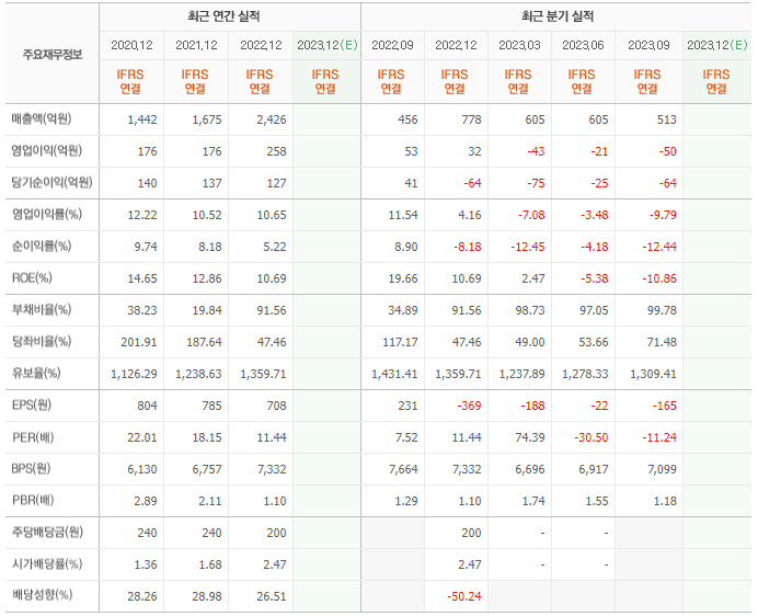 2022년 매출은 2426억, 영업이익은 258억, 당기순이익은 127억입니다. 그리고 영업이익률은 10.65%입니다.