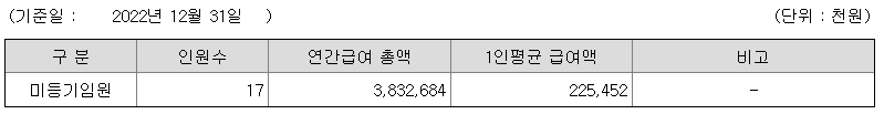 미등기임원의 평균연봉은 2억 2545만원이고 직원수는 17명입니다.