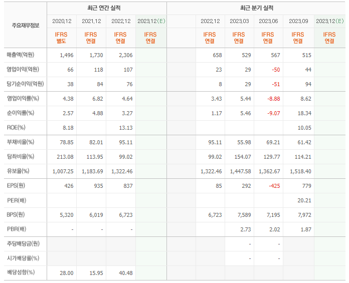 2022년 매출은 2306억, 영업이익은 107억, 당기순이익은 76억입니다. 그리고 영업이익률은 4.64%입니다.