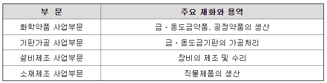 당사는 공시서류 작성기준일 현재 재화의 종류별로 사업부문을 구분하고 있으며 각 세부 부문별로 수익을 창출하는 재화와 용역의 내역은 다음과 같습니다.