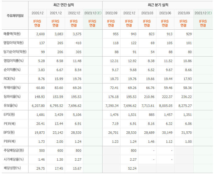 2022년 매출은 3575억, 영업이익은 410억, 당기순이익은 305억입니다. 그리고 영업이익률은 11.48%입니다.