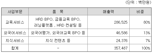 교육사업 부문은 온라인과 집합교육 서비스로 구성되어있습니다. 교육 플랫폼인 러닝플랫폼을 기반으로 IT/ 경영/ 전문직무/ 리더십 등 직무 분야의 역량 강화를 위한 교육서비스를 주로 제공하고 있습니다. 또한 HR 컨설팅, 컨텐츠 개발 및 운영, 시스템 구축까지 전반적인 HRD 프로세스를 아웃소싱하는 교육 BPO 서비스를 제공하고 있습니다.