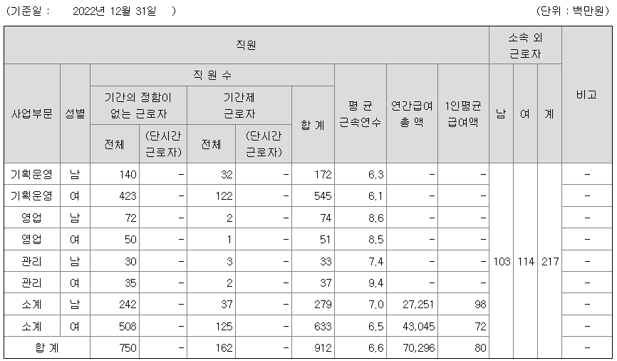 미등기임원의 평균연봉은 2억 7800만원이고 직원수는 6명입니다.