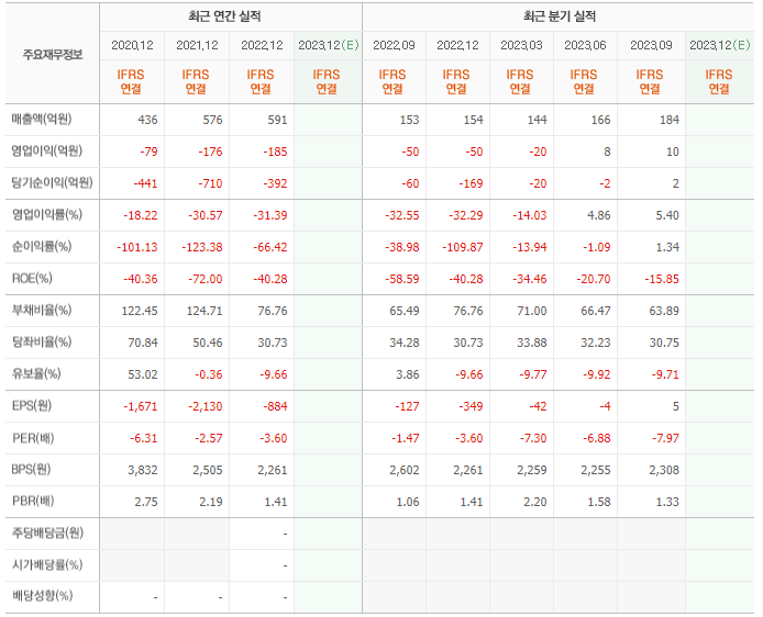 2022년 매출은 591억, 영업이익은 -185억, 당기순이익은 -392억입니다. 그리고 영업이익률은 -31.39%입니다.