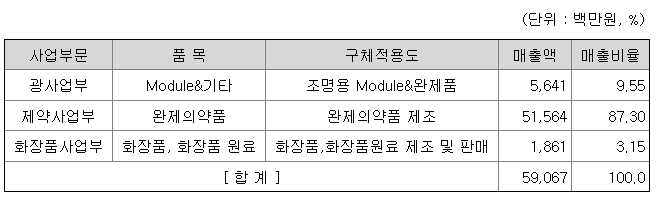 당사는 정교한 반도체 기술을 바탕으로 LED광원을 이용한 일반조명, IT Display BackLight Unit, 자동차 조명 등의 주요 핵심 광원 & 조명용 Module Set를 개발, 생산하여 판매를 하고 있습니다. 또한 사업영역 확대를 위하여 신약개발, 의약품의 제조ㆍ판매, 화장품의 제조ㆍ판매, 전자제품ㆍ전자부품의 제조ㆍ도소매업을 영위하고 있습니다.