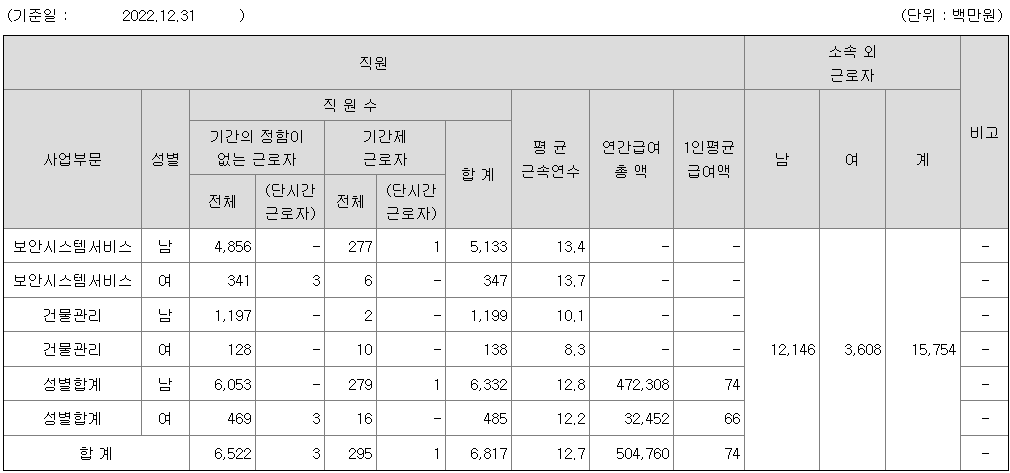 당사는 '종합 안심솔루션 회사'로서 주요 사업으로 시큐리티 서비스와 인프라 서비스 사업을 영위하고 있으며, 첨단 보안시스템과 부동산 종합 서비스 역량, 차별화된 고객서비스로 대한민국의 시큐리티 서비스, 부동산 서비스 및 보안SI(System Integration) 시장을 선도하고 있습니다.