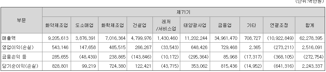 3. 화학제조업: 화학제조업 사업부문의 주요 사업은 석유화학원료, 석유화학가공, 지주회사, 석유화학원료 등입니다.