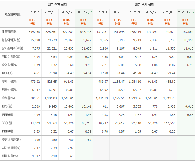2022년 실적은 62조 2784억, 영업이익은 2조 5161억입니다. 그리고 영업이익률은 4.04%입니다.