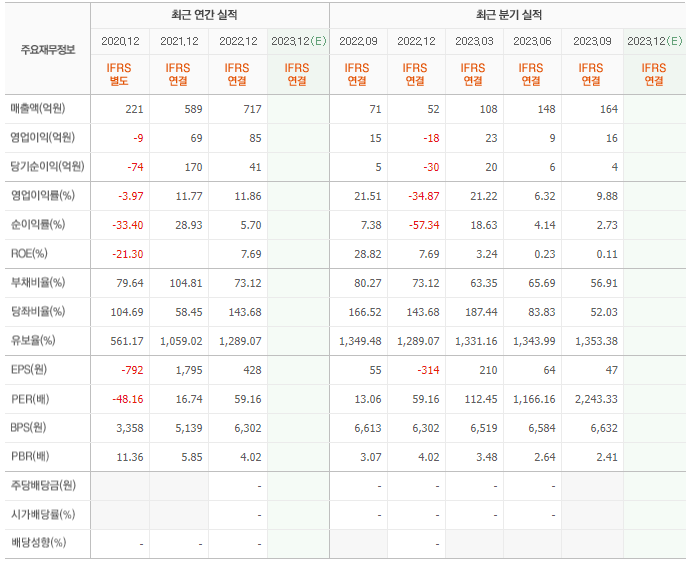 2022년 매출은 717억, 영업이익은 85억, 당기순이익은 41억입니다. 그리고 영업이익률은 11.86%입니다.