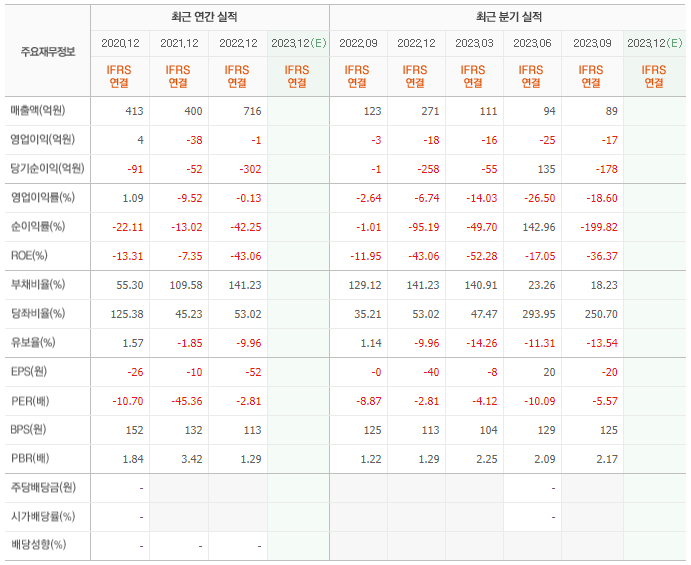 2022년 매출은 716억, 영업이익은 -1억, 당기순이익은 -302억입니다. 그리고 영업이익률은 -0.13%입니다.