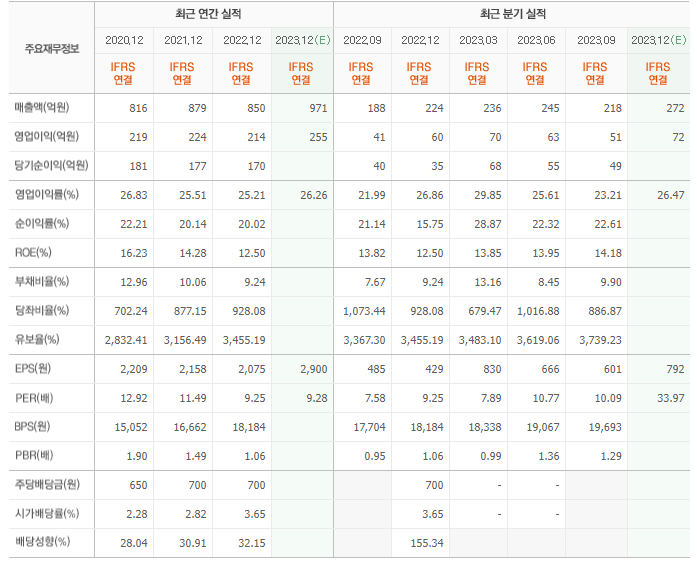 2022년 매출은 850억, 영업이익은 214억, 당기순이익은 170억입니다. 그리고 영업이익률은 25.21%입니다.