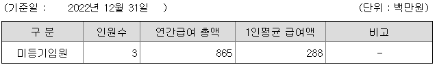 미등기임원의 평균연봉은 2억 8800만원이고 직원수는 3명입니다.