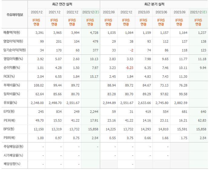 2022년 매출은 3994억, 영업이익은 104억, 당기순이익은 60억입니다. 그리고 영업이익률은 2.60%입니다.