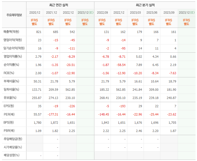 2022년 매출은 542억, 영업이익은 -45억, 당기순이익은 -111억입니다. 그리고 영업이익률은 -8.29%입니다.