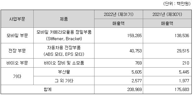 당사는 1992년 8월에 설립되어 경북 구미시 국가산업4단지에 본사(제1사업장)와 제2사업장 및 제3사업장을 두고, 모바일 카메라모듈에 장착되는 정밀부품과 자동차용 전장부품을 전문적으로 생산 판매하고 있습니다. 각 사업부문별 주요 제품 및 매출액은 다음과 같습니다.