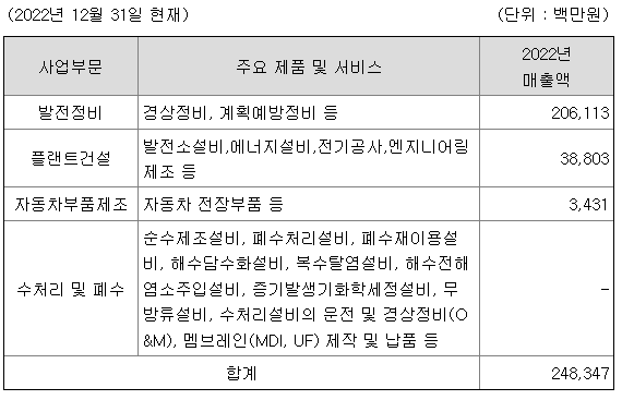 당사의 사업부문은 크게 플랜트건설사업부문과 발전소경상정비사업부문으로 구분하고 있습니다.