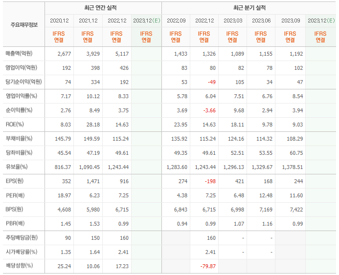2022년 매출은 5117억, 영업이익은 426억, 당기순이익은 192억입니다. 그리고 영업이익률은 8.33%입니다.