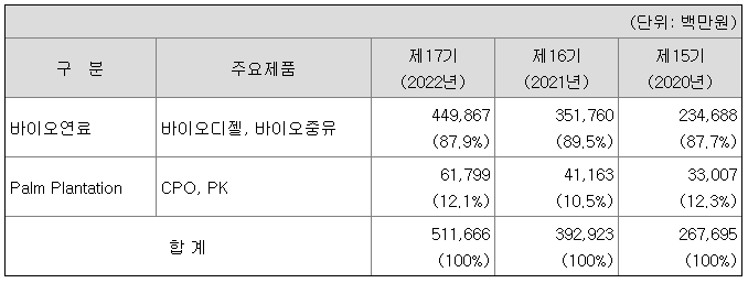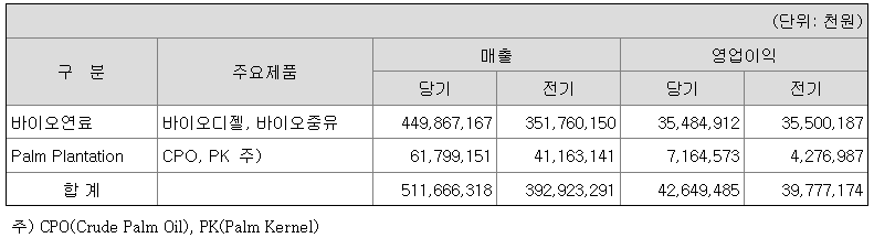 연결회사는 주력 사업분야인 바이오연료 사업부문과 2012년 부터 신성장동력 확보 를 위해 전략사업으로 추진해온 팜 플랜테이션 (Palm Plantation) 사업부문의 총 2개 사업부문 체제로 운영되고 있습니다.