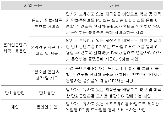 당사는 만화 콘텐츠를 전자책(e-Book)으로 변환하여 PC 또는 모바일 디바이스를 통해 이용할 수 있도록 서비스하는 온라인 만화 콘텐츠 사업과 웹소설 사업, 만화 콘텐츠를 도서로 출판하여 판매하는 만화 출판사업, 게임 소프트웨어를 개발하여 PC 및 모바일을 통해 서비스하는 온라인게임 사업을 영위하고 있습니다. 이를 통해 온라인 만화 콘텐츠 매출, 만화 출판 매출, PC게임 매출, 모바일게임 매출이 발생하고 있습니다.