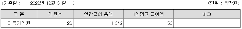 미등기임원의 평균연봉은 5200만원이고 직원수는 26명입니다.