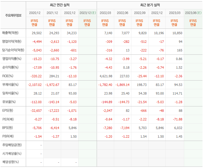 2022년 실적은 3조 4233억, 영업이익은 -1120억입니다. 그리고 영업이익률은 -3.27%입니다.
