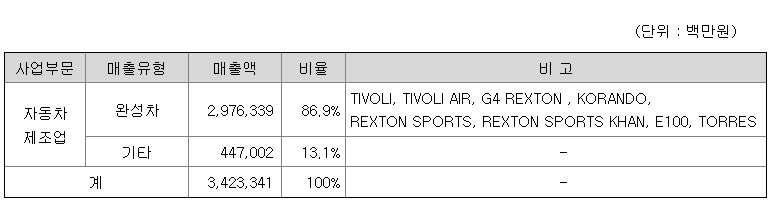 연결실체는 각종 차량의 제조 및 판매를 주요 사업으로 영위하고 있으며, 당기말 총 매출액에서 각 매출 유형별로 차지하는 비율은 다음과 같습니다.
