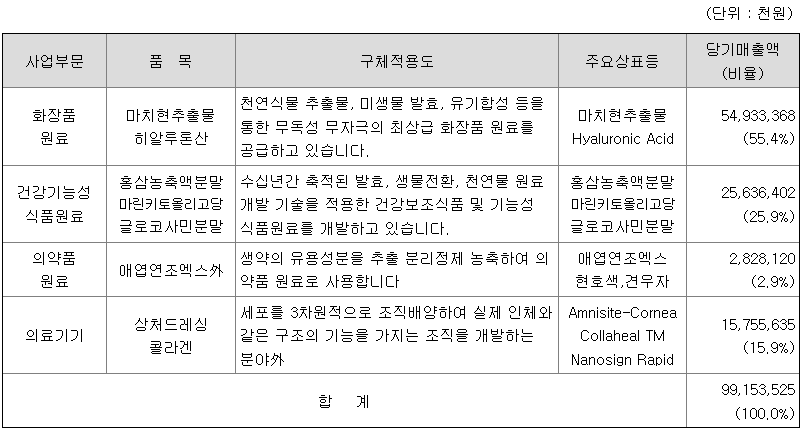 그리고 중국, 동남아시아 등 신규시장의 성장에 맞춰 천연 기능성 소재에 대한 니즈는 더욱 높아질 것으로 예상되고 있습니다. 따라서 당사는 시장의 성장과 기능성 소재에 대한 다양한 니즈를 충족시키기 위해 지속적으로 천연소재의 발굴을 위한 연구개발을 진행하고 있으며 차세대 Big Item 개발을 위해 모든 R&D 인프라를 집중하고 있습니다.