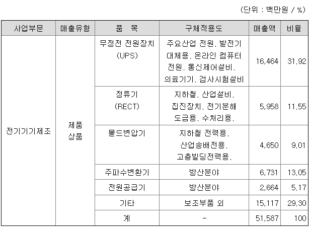 당사가 영위하는 사업 부문별 주요 제품으로는 UPS(무정전 전원장치) 및 몰드변압기, 통신용 전원장치, 정류기 등 다양한 전원공급장치 및 전력변환장치 등이 있습니다. → 제품에 관한 사항은 2. 주요 제품 및 서비스의 가. 주요 제품의 명칭 및 특성 항목을 참고하시기 바랍니다.