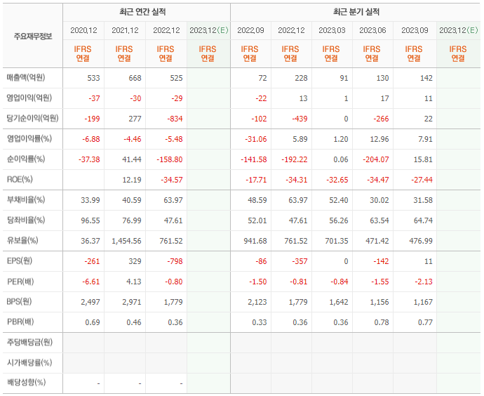 2022년 매출은 525억, 영업이익은 -29억, 당기순이익은 -834억입니다. 그리고 영업이익률은 -5.48%입니다.