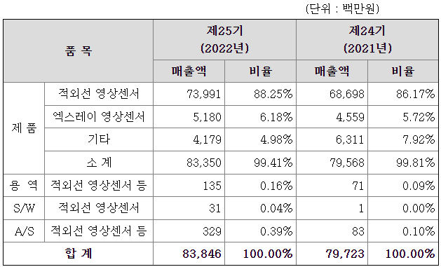 당사는 사람의 눈으로 인식불가능 영역(비가시광영역)인 엑스레이 대역에서부터 적외선 대역에 이르기까지의 다양한 전자기파 에너지 정보를 가시영상정보로 전환시켜주는 영상센서 및 관련 제품을 개발 및 제조하는 사업을 영위하고 있습니다. 주력 제품으로는 1) 적외선 영상센서, 2) 엑스레이 영상센서, 3) 적외선 영상 시뮬레이터, 4) 가시광 영상센서 모듈 등으로 다양한 영상센서 제품 및 영상 관련 시스템 등을 국방용, 의료용, 우주용 등으로 개발, 제조, 판매하고 있습니다.
