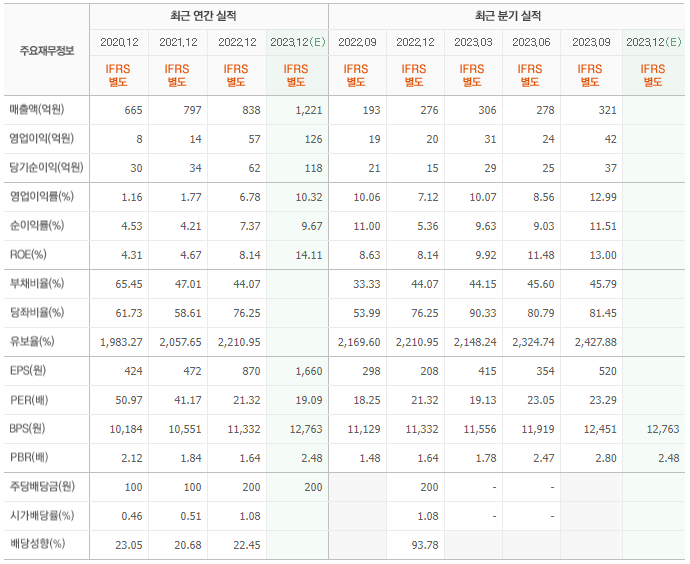 2022년 매출은 838억, 영업이익은 57억, 당기순이익은 62억입니다. 그리고 영업이익률은 6.78%입니다.