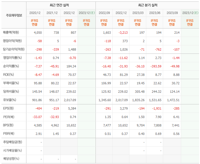 2022년 매출은 807억, 영업이익은 -6억, 당기순이익은 1488억입니다. 그리고 영업이익률은 -0.70%입니다.