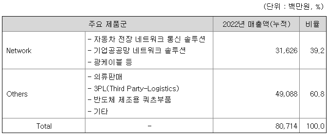 당사와 연결종속회사(이하'연결실체')는 네트워크 장비와 솔루션의 개발 및 공급 중심으로 하는 '네트워크 부문'이 주력 사업이며, 이 외 의류판매, 3PL, 반도체 제조용 쿼츠부품 개발/생산 등으로 이루어져 있습니다. 신규 사업으로 '자동차 전장'에 적용되는 네트워크 통신 솔루션 사업 등을 육성하고 있습니다.