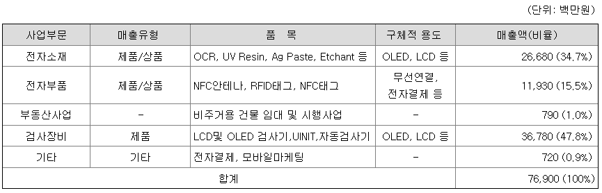 당사의 주요 생산제품은 디스플레이 검사장비 및 장치 제품제조와 부품산업으로, 이러한 전방산업인 디스플레이 산업에 절대적인 영향을 받고 있습니다. 디스플레이 산업은 반도체산업에 비하여 기술 변화의 속도가 매우 빨라 생산되는 유리기판의 크기가 급격하게 커지고 있으며 이에 따라 더 높은 세대의 공장 건설이 지속적으로 이루어지고 있습니다. 디스플레이 장비 산업은 이러한 디스플레이 산업의 기술 변화속도에 대응하여 새로운 공정에 맞는 기술을 제공할 수 있어야 하므로 패널업체의 기술변화에 따라 새로운 기술개발이 지속적으로 요구됩니다.